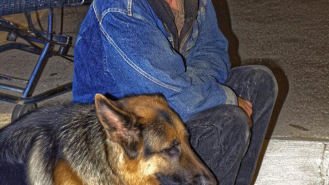 He sat on the curb near the cart corral, coat too thin for the weather, shoulders hunched in that way people get when they’re trying to make themselves smaller. Next to him, a German Shepherd leaned against his leg, pressed so close it was almost like the dog was trying to hold him up.